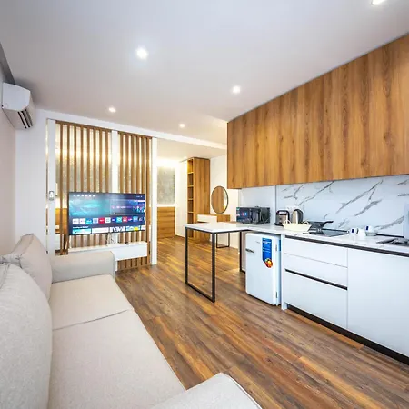 Hver enhed har et opholdsområde og et fladskærm samt et køkken.